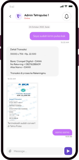 Kirim bukti transfer atau konfirmasi (jika bukti tidak keluar dan pulsa sudah terpotong) melalui Chat Customer Service
