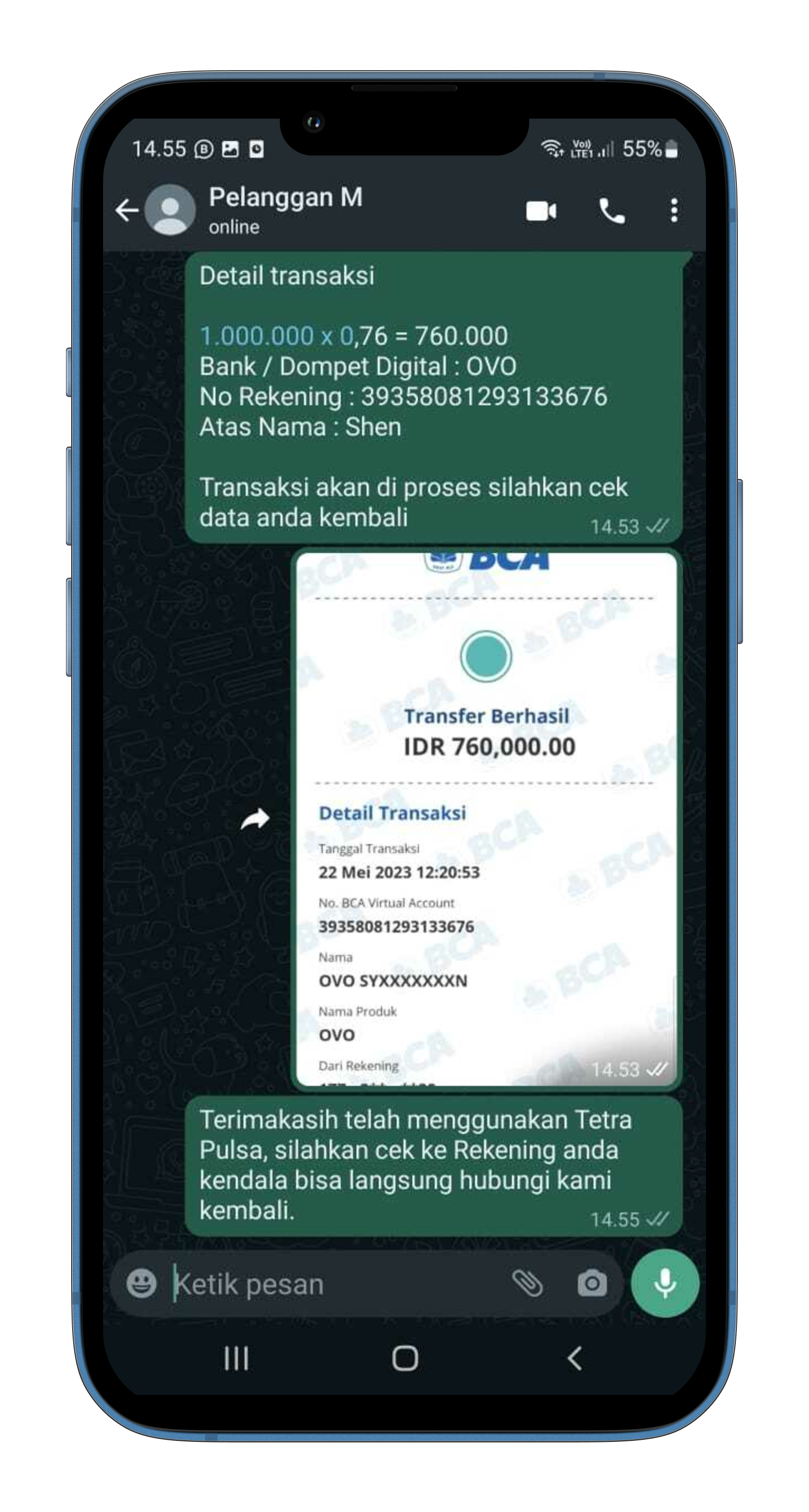Setelah transfer pulsa berhasil kirimkan bukti transfer pulsa atau konfirmasi (jika bukti tidak keluar dan pulsa sudah terpotong) ke admin
